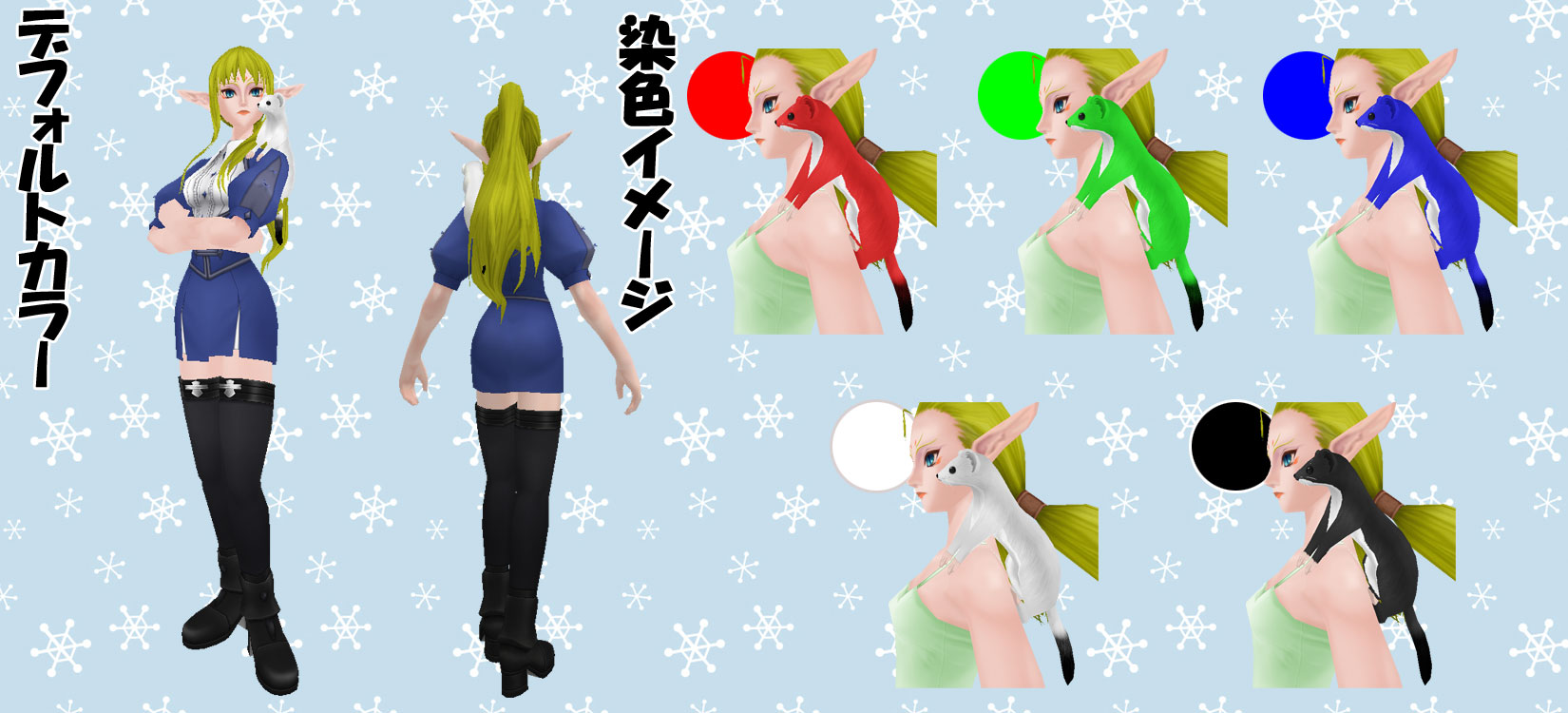 | ◇肩乗りオコジョ NEW! | | 装備部位 | 肩(防) | 必要スキル | 着こなし 11.0 | アーマークラス | 1.3 | 〈付加効果〉 山の妖精:移動速度と水中移動速度が10%上昇して、ダンスの効果が増加する ※WarAgeでは効果がない